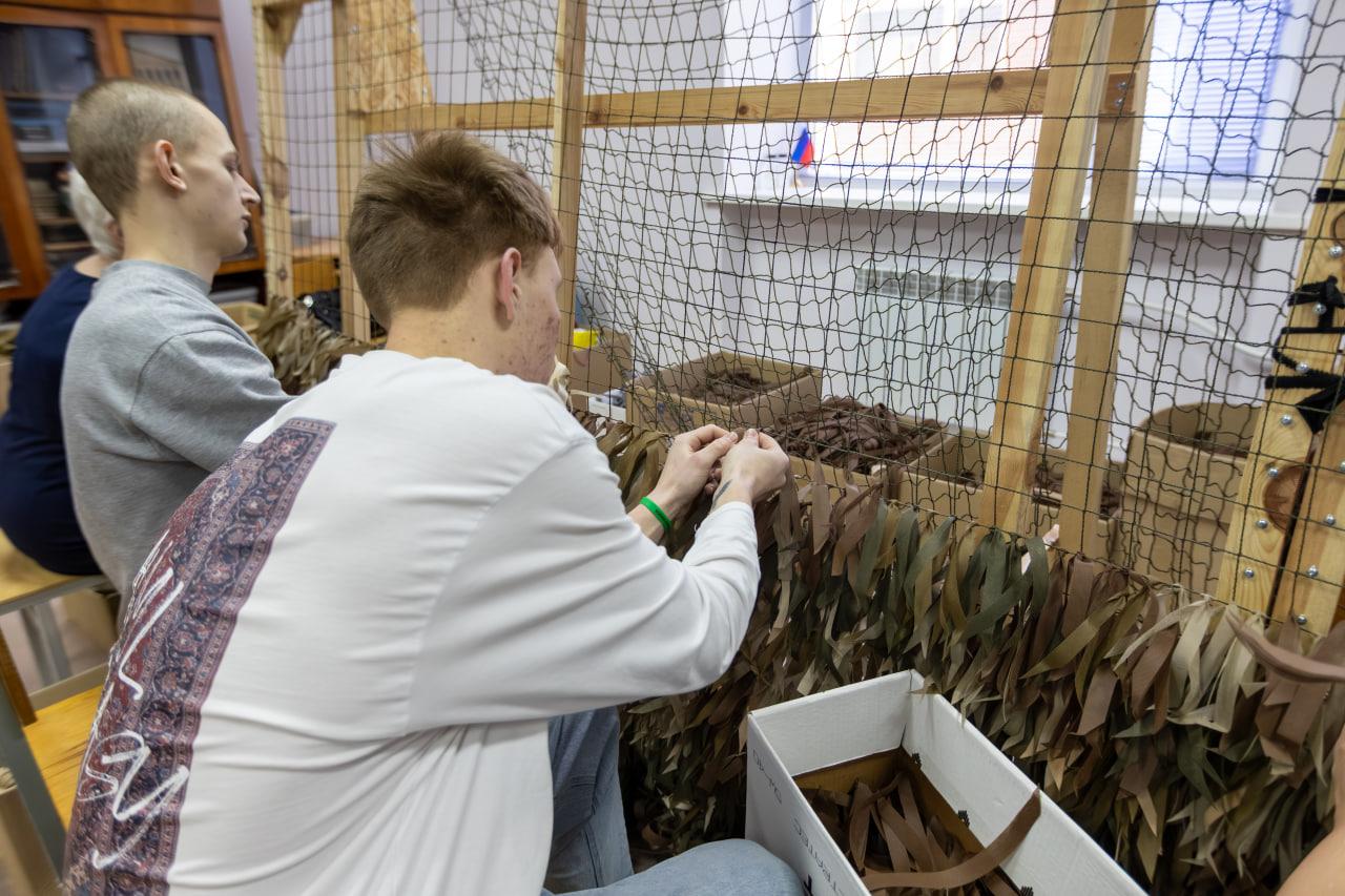 Сразу после открытия экспозиции в аудитории 2002 добровольцы УГГУ провели для всех желающих мастер-класс по плетению сетей. Напомним, что изготовлением защитных накидок и сбором гуманитарной помощи для российских военных в университете занимаются уже несколько лет. За свой самоотверженный труд активисты были отмечены на IV Форуме волонтеров СВО, который проходил в Екатеринбурге в начале февраля. Директор ИДПО УГГУ Андрей Лёгостев, специалист ИДПО Ирина Болтенкова, водитель Николай Давыдов и студенты Александр Вирц (гр. ГСД-21) и Илья Петрожицкий (гр. ПБ.ш-23-2) получили благодарственные письма от Свердловского регионального отделения Всероссийского комитета поддержки президента России В.В. Путина. А заведующую лабораторией кафедры горного дела Елену Риве наградили не только благодарственным письмом, но и медалью «За содействие СВО».